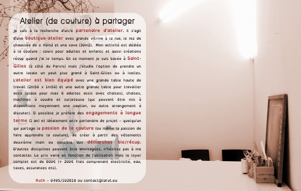Je suis à la recherche d’un/e partenaire d’atelier. Il s’agit d’une boutique-atelier avec grande vitrine à la rue, au rez de chaussée de ± 50m2 et une cave (20m2) à côté du Parvis de Saint-Gilles.